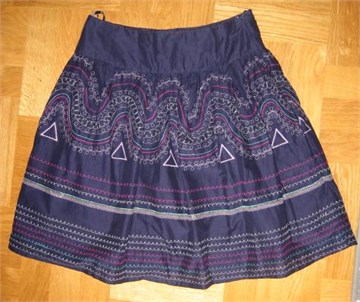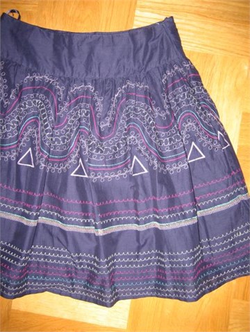 Lagana i prozračna ljetna suknja, indigo plave boje sa prošivima u svijetlo zelenoj, lila , žutoj i boji ciklame. Podstavljena. Bočni cif.