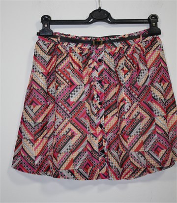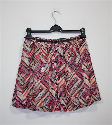 Atmosphere suknja sa šarenim uzorkom (boje i uzorci kao na slikama). Prednje kopčanje, uska pasica za remen sa pripadajućim remenčićem (crni, imitacija kože). Stražnja strana pasice ima provedenu gumu pa je širina prilagodljiva (vidjeti mjere). Lagana i prozračna, podstavljena.