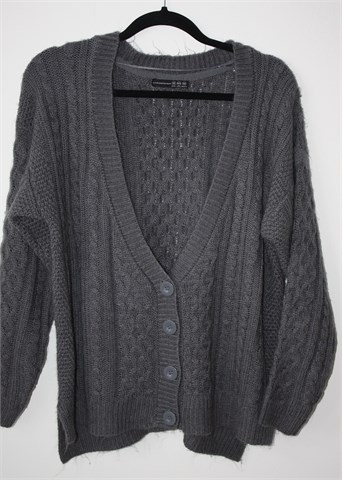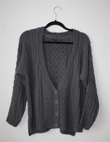 Atmosphere vesta sa kopčanjem/kardigan sive boje. Bočni prorezi, nešto duža sa stražnje strane (vidjeti mjere). Mucasto pletivo srednje debljine, rastezljivo.