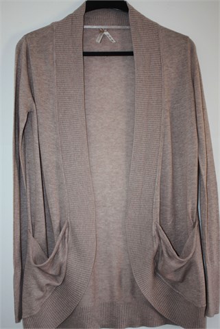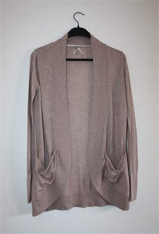 Atmosphere vesta/kardigan prošarano svijetlo smeđe-bež boje. Bočni džepovi, bez kopčanja. Tanja, mekana i rastezljiva.