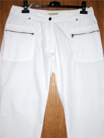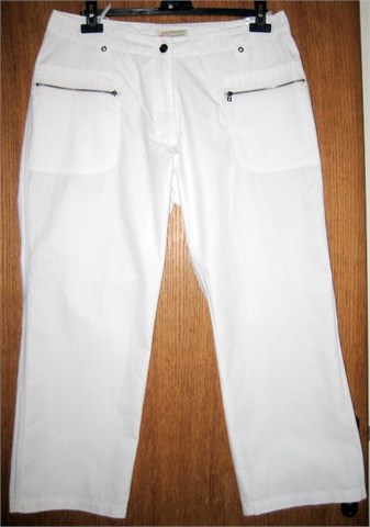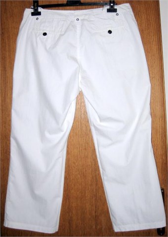 Poluduge hlače bijele boje. Prednji cif i kopčanje, pasica za remen. Prednji džepovi sa cifom, stražnji sa gumbićima. Veličina na hlačama piše 46 (vidjeti mjere).
