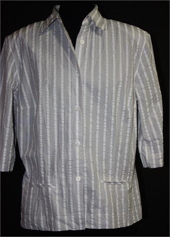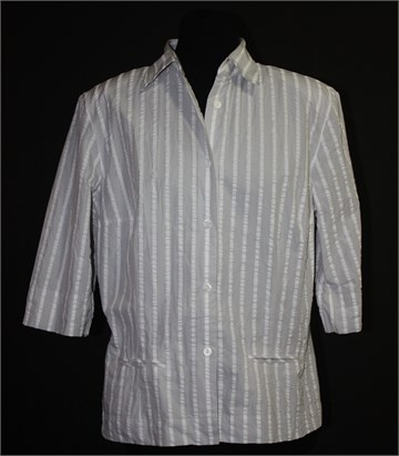 B.M. company Blousemakers košulja sa poludugim rukavima, svijetlo sive boje sa bijelim prugama. Prednje kopčanje, mali bočni džepovi (još uvijek zašiveni). Prednji i stražnji ušitci (blago strukirana), mali jastučići u ramenima (mogu se odšiti). Materijal je blago zgužvan, mali prorez na kraju svakog rukava.