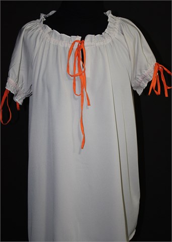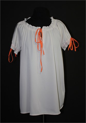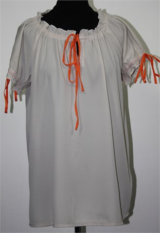 B. Young bluza sa kratkim rukavima, sivo-bež boje. Narančaste vezice (na rukavima i ovratniku), mogu se stegnuti po želji. Lagan i prozračan materijal, blago providan.