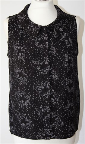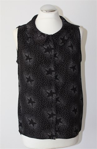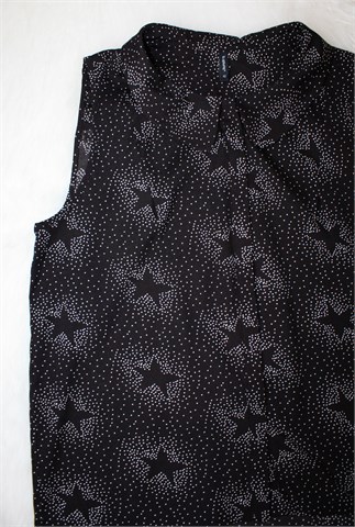 B. Young košulja bez rukava, crne boje sa bijelim printom zvijezdica. Prednje skriveno kopčanje, Petar Pan ovratnik. Duža sa stražnje strane (vidjeti mjere), blago rastezljiva.