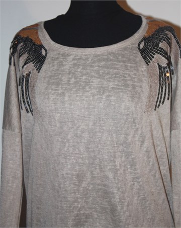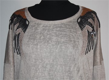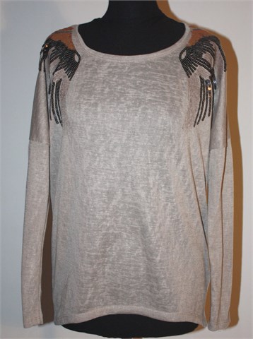 BBG vesta svijetlo bež boje s ukrasnim prošivima od konca i našivenim šljokicama. Tanko, lagano i rastezljivo pletivo. Rukavi su širi oko ramena, uži uz ruku.
