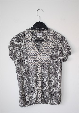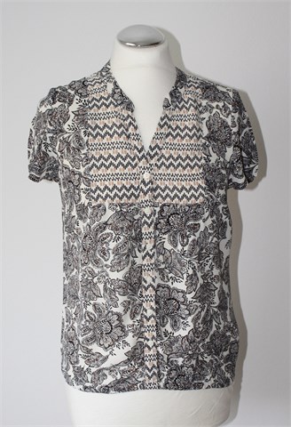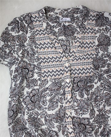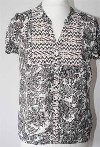 BHS Petite bluza sa kratkim rukavima, prljavo bijelo-bež boje (oznaka boje na etiketi - stone) sa printom (boje i uzorak printa vidljivi na slikama - prevladavaju crna i smeđa boja). Prednje kopčanje (na dnu pasice bluza je zašivena i ušivena je gumica pa se ne može do kraja otkopčati). Blago rastezljiva.