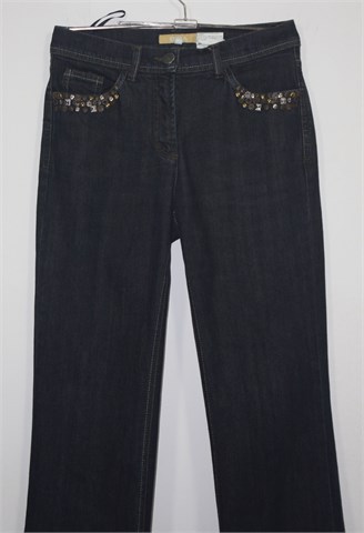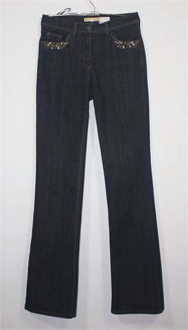 BIBA traper hlače tamno plave boje. Prednji cif i kopčanje, pasica za remen. Prednji i stražnji džepovi (prednji ukrašeni našivenim aplikacijama, stražnji ukrašeni aplikacijama od konca). Rastezljive.