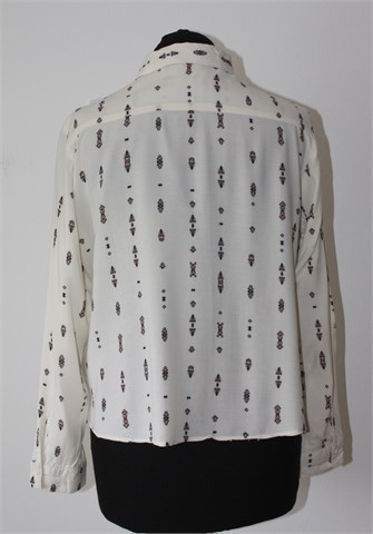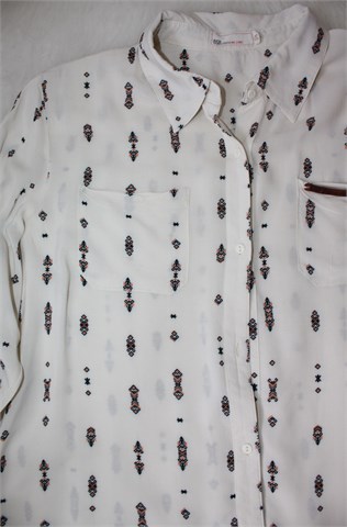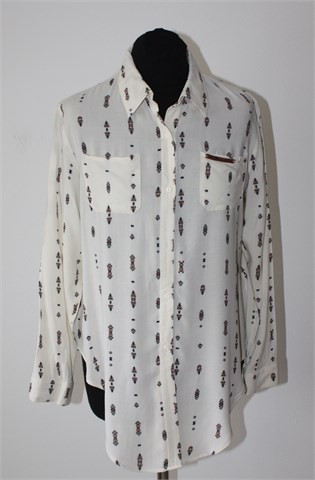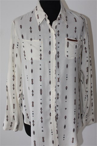BSB jeans košulja sa dugim rukavima, prljavo bijele boje sa printom (uzorak printa vidljiv na slikama). Prednje kopčanje (jedan gumbić se odšio ali za etiketu je zašiven rezervni), džepić na prsima. Stražnja strana je duža (vidjeti mjere). Tanja i lagana, nije rastezljiva (providna).