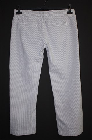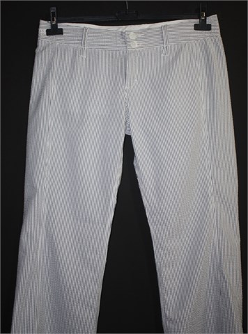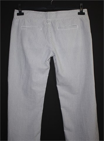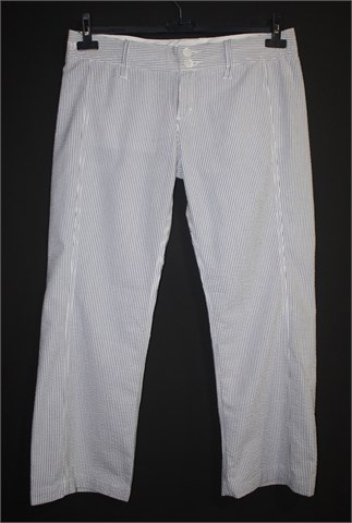 Hlače iz Baby Angel kolekcije OVS-a dizajnirane by Elio Fiorucci. Bijele boje sa plavim prugama, materijal je blago zgužvan pa su vrlo jednostavne za održavanje. Prednji cif i kopčanje, pasica za remen. Sa stražnje strane skriveni džepovi. Lagan i prozračan pamuk. Nogavice nisu skroz duge (vidjeti mjere za dužinu)