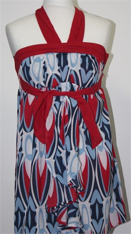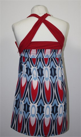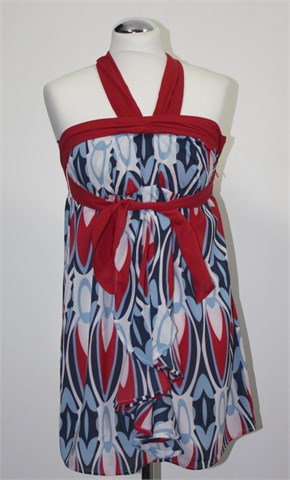 Baby Phat bluza bez rukava, odlična kombinacija plave, bijele i crvene boje (uzorak printa vidljiv na slikama). Rezana ispod prsiju, sa prednje strane (na sredini dekoltea) su našivene dvije dugačke crvene trake (mogu se zavezati na više načina). Bočni cif, podstavljena u gornjem dijelu. Tanja i lagana, rastezljiva.