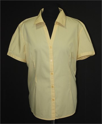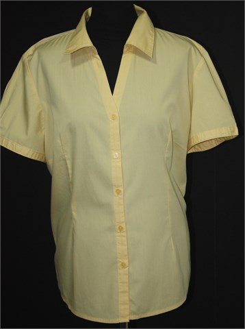 Basic Editions košulja sa kratkim rukavima, lijepe svijetlo žute boje (zagasitija nijansa nego na slici). Prednje klasično kopčanje, prednji i stražnji ušitci (blago strukirana).