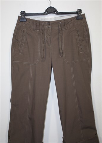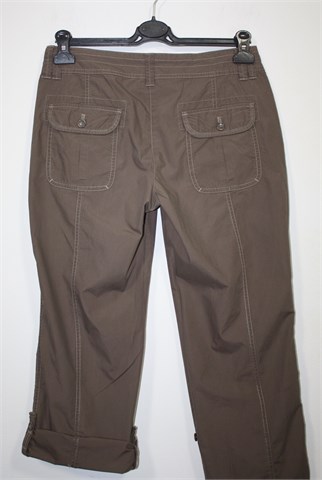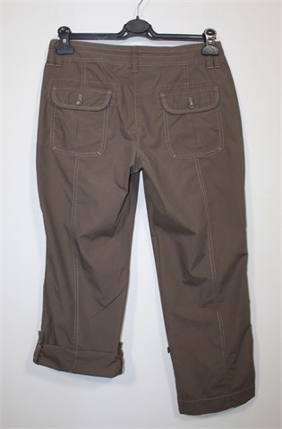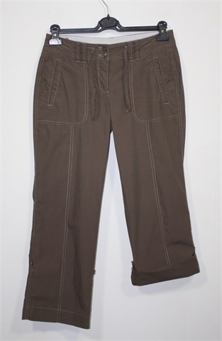 Basic Line poluduge hlače smeđe boje, casual kroja. Prednji cif i kopčanje, pasica za remen. Prednji i stražnji džepovi. Lagan i tanji pamuk, nije rastezljiv. Nogavice se mogu nositi i kao kraće (vidljivo na slici).