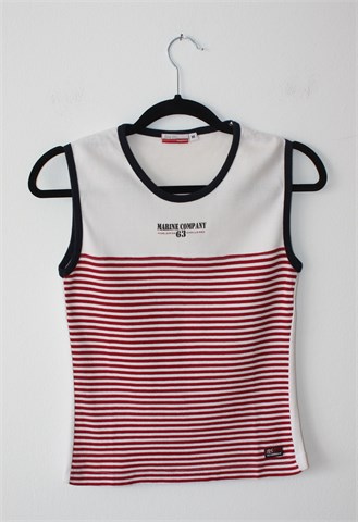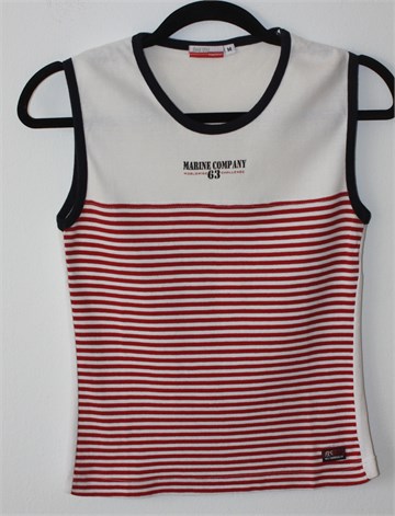 Basic Style majica bez rukava, bijele boje sa tamno plavim obrubima i crvenim prugama sa prednje strane. Mekan i rastezljiv pamuk.