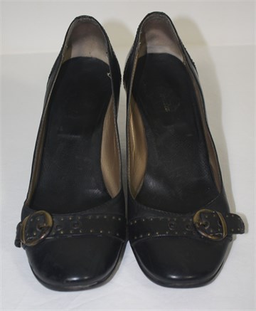 Bata cipele na petu, crne boje sa prednjim ukrasnim remenčićem. Peta visine cca 7 cm.
