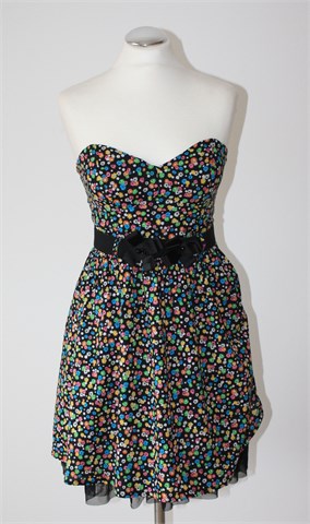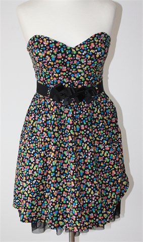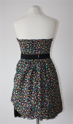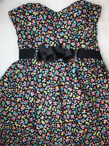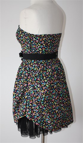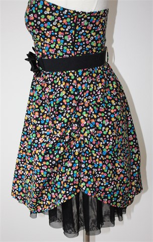 Be Beau haljina crne boje sa šarenim cvjetnim printom (boje i uzorak printa vidljivi na slikama). Bez naramenica (postoje utori za zakačiti naramenice ali naramenice ne dolaze uz haljinu), na leđima je ušivena blaga gumica (malo rastezljivo). Bočni cif, ušice za remen sa pripadajućim remenom (može se skinuti). Dio iznad prsiju je podstavljen (ne mora se nositi grudnjak), za podstavu je na dnu našiven til u dva reda (haljina je bočno malo nabrana pa je til sa te strane više vidljiv, inače je til najdonji dio haljine).