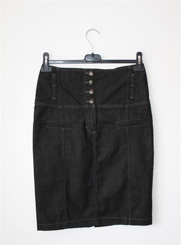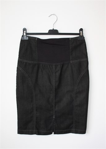 Bellissima traper suknja sa viskim strukom, tamno sive boje (sa stražnje strane pasice dio materijala je tanji i rastezljiv - prilagodljiva širina, vidjeti mjere). Prednji cif i kopčanje, duple ušice za remen. Imitacija džepova sa prednje strane, mali stražnji rasporak. Blago rastezljiva.