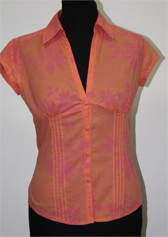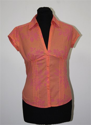 Ben Sherman košulja sa kratkim rukavima, narančaste boje sa ciklama rozim cvjetnim printom. Sa prednje strane kopčanje i ukrasni ušitci. Strukirana i vrlo blago rastezljiva.