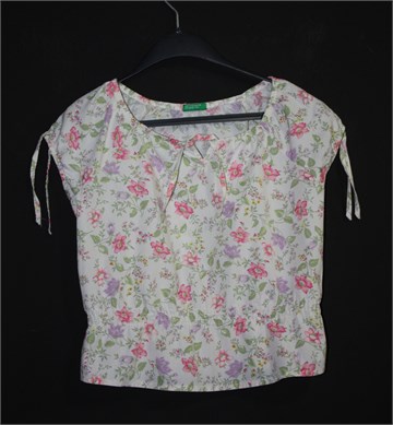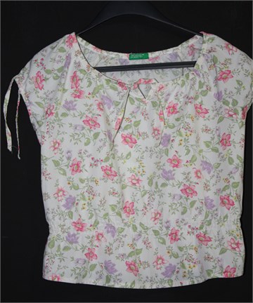 Benetton bluza sa kratkim rukavima, prljavo bijele boje sa cvjetnim printom. Vezice na krajevima rukava i sa prednje strane. U struku blago stegnuta gumicama. Tanji i čvrsti pamuk.