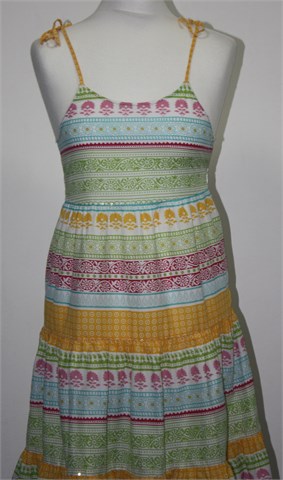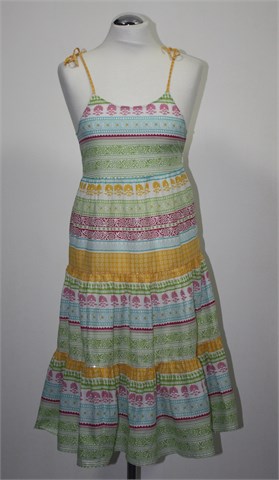 Benetton ljetna pamučna haljina bijele boje sa šarenim printom i mjestimično našivenim diskretnim šljokicama. Tanke naramenice (vežu se na željenu dužinu sa mašnicom), bočni cif. Lagan i prozračan pamuk.