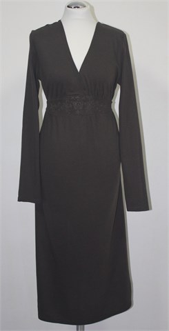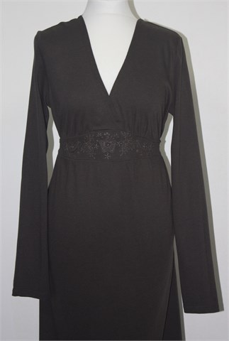 Benetton haljina sa dugim rukavima, smeđe boje s aplikacijama od konca (ispod grudi) i vezanjem u struku. Prednji fiskni preklop, rezana u struku. Materijal je tanak i lagan, blago rastezljiv.