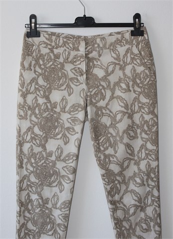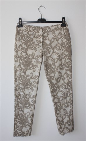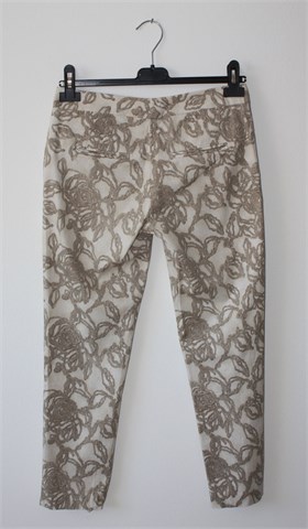 Benetton hlače bež-sive boje sa printom (boje i uzorak printa kao na slikama). Prednji cif i kopčanje, prednji bočni džepovi (stražnji samo ukrasni). Mekane i rastezljive, nisu skroz dugačke (vidjeti mjere za dužinu). Malo se odšio unutarnji porub nogavice ali bez problema se uhvati koncem.
