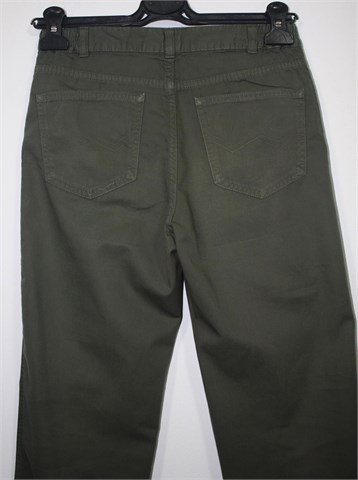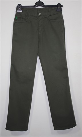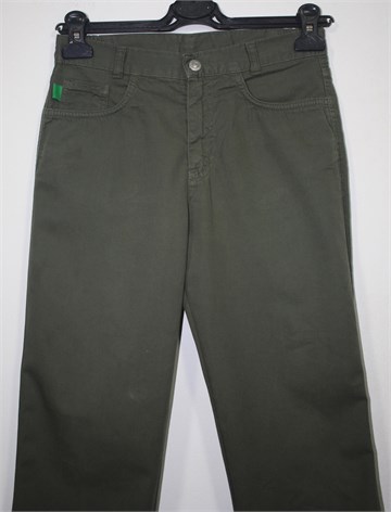 Benetton pamučne hlače maslinasto zelene boje. Prednji cif i kopčanje, pasica za remen. Prednji i stražnji klasični džepovi. Bočno u struku gumice pa je širina malo prilagodljiva.