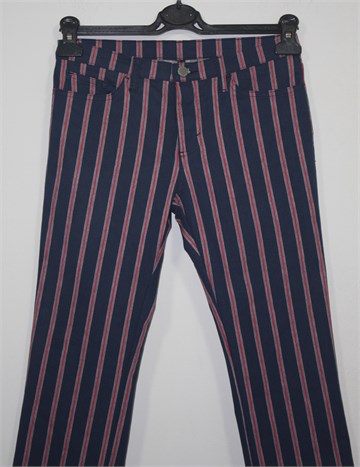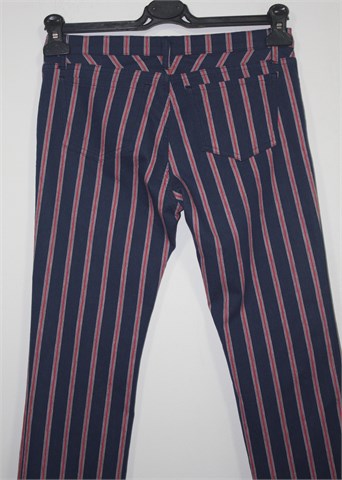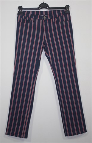 Benetton hlače tamno plave boje sa crveno-bijelim prugama (materijal djeluje kao tanji traper). Prednje kopčanje, pasica za remen. Prednji i stražnji klasični džepovi. Nogavice su 7/8, nisu skroz dugačke (vidjeti mjere). Materijal je lagan ali čvrst, vrlo rastezljiv - odlično se formiraju po tijelu.