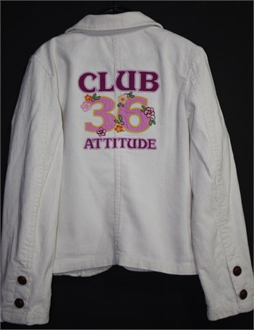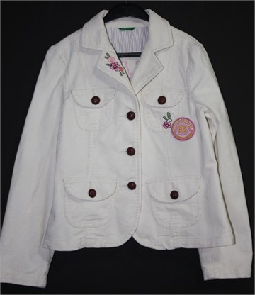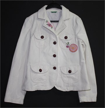 Benetton jaknica od samta, svijetlo bež/prljavo bijele boje. Prednje kopčanje, bočni džepovi i džepići na prsima. Ukrasni prišivci i aplikacije (sa obje strane).
