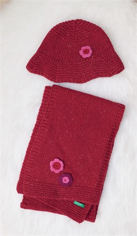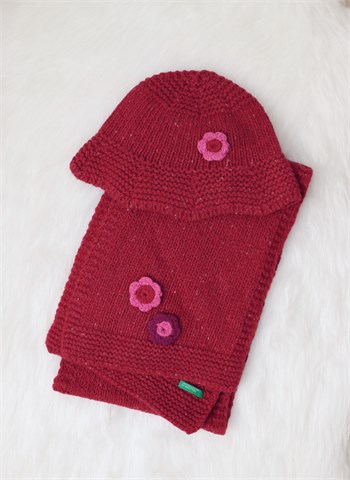 Benetton komplet (šal i kapa) prošarano (špricano) crvene boje sa našivenim ukrasnim cvjetićima (vidljivo na slikama). Mekano i rastezljivo pletivo, toplo.