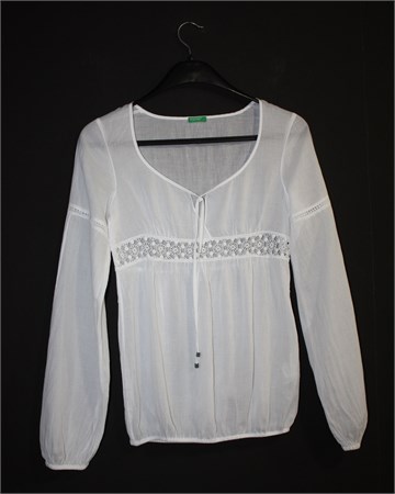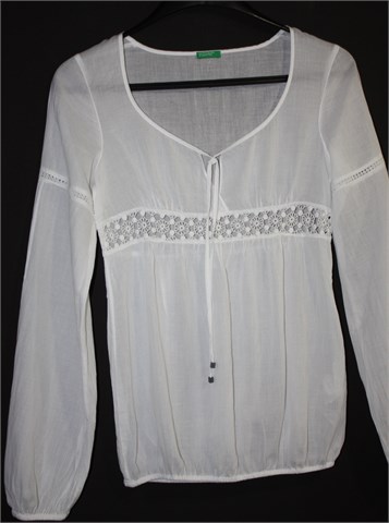 Benetton bluza/košulja sa dugim rukavima, bijele boje. Ispod prsiju i na rukavima heklani detalji (providni), vezica sa prednje strane. Širi rukavi, stegnuta gumicama na krajevima rukava i na dnu pasice. Tanji i lagan pamuk, providan. Bočni cif.