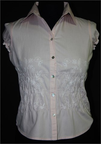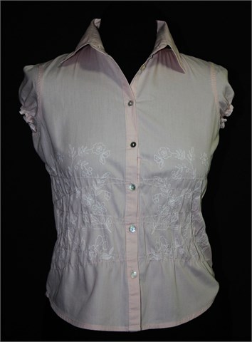 Benetton košulja sa kratkim rukavima, svijetlo roze boje. Sa obje strane prošivena sa koncem, sa prednje strane prošivena cvjetnim aplikacijama od bijelog konca. Prednje klasično kopčanje.
