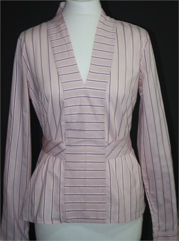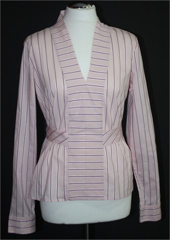 Benetton košulja sa dugim rukavima, roze boje sa ljubičastim i sjajno rozim prugama. Vezanje sa stražnje strane. Lagan i vrlo blago rastezljiv materijal.