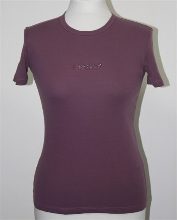 Benetton majica sa kratkim rukavima, zagasito ljubičaste boje sa prednjim ukrasnim natpisom Benetton od raznobojnih cirkončića. Vrlo mekan i rastezljiv pamuk.