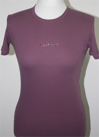 Benetton majica sa kratkim rukavima, zagasito ljubičaste boje sa prednjim ukrasnim natpisom Benetton od raznobojnih cirkončića. Vrlo mekan i rastezljiv pamuk.