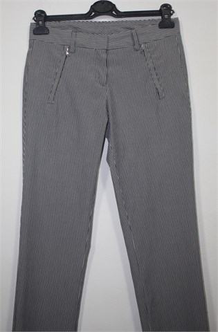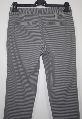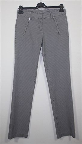 Benetton prugaste hlače, kombinacija sive i bijele boje. Prednji cif i kopčica, pasica za remen. Prednji kosi džepovi sa cifom, stražnji ukrasni. Lagan, tanji i nerastezljiv materijal.