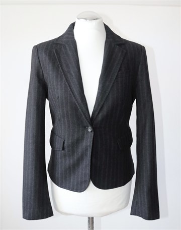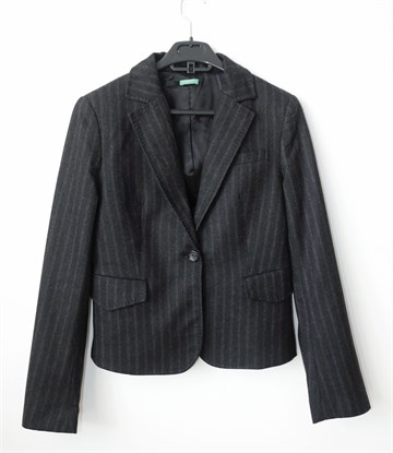 United Colour of Benetton sako tamno sive boje sa svijetlije sivim prugama. Kopčanje sa jednim gumbić sa prednje strane, prednji džepići sa preklopom. Tanki jastučići u ramenima, podstavljen.