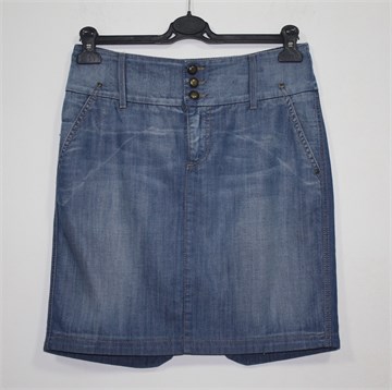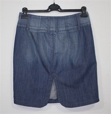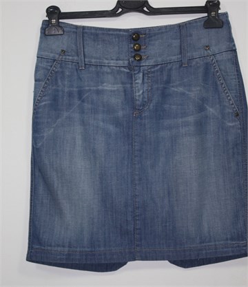 Benetton suknja od trapera, svjetlije plave boje mjestimično ispranog izgleda (tvornički used look). Prednji cif i kopčanje, široka pasica za remen. Prednji bočni džepovi, rasporak sa stražnje strane. Stražnja strana je malo duža od prednje (vidjeti mjere za dužinu).