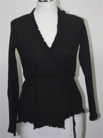 Benetton vesta na preklop i vezanje, prošarano tamnije smeđe/crne boje (vesta na sebi ima flekasto/mucavi uzorak, takva je tvornički). Topla i mucava, vrlo blago rastezljiva.