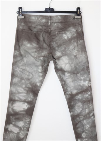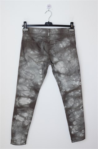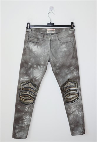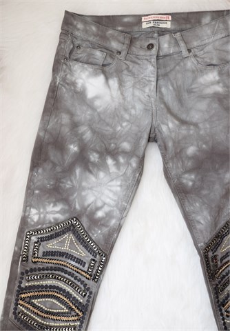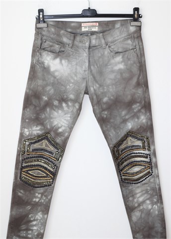 Berenice's Denim traper hlače prošarane boje, na nogavicama sa prednje strane aplikacije (od šljokica i konca). Prednji cif i kopčanje, pasica za remen. Prednji i stražnji džepovi. Rastezljive.