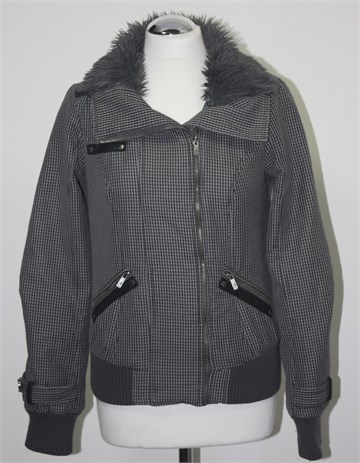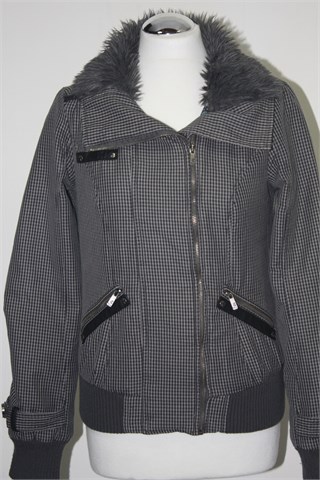 Bershka jakna u prugastoj kombinacija sive, bijele i crne boje (djeluje prošarano sivo), s umjetnim sivim krznom na ovratniku. Prednji cif, bočni džepovi sa cifom. Ukrasi od umjetne kože, stegnuta na dnu rukava i na pasici. Podstavljena i vrlo blago punjena. Imala je kapuljaču ali ne dolazi uz jaknu (cif od kapuljače se ne vidi od kragne i krzneka).