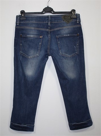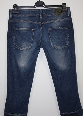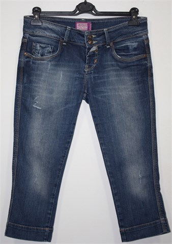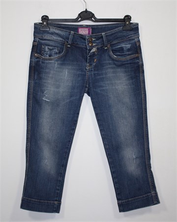 Bershka Denim poluduge traper hlače, srednje plave boje mjestimično ispranog i iscufanog izgleda (tvonički used look). Prednji cif i kopčanje, pasica za remen. Prednji i stražnji džepovi. Blago rastezljive.