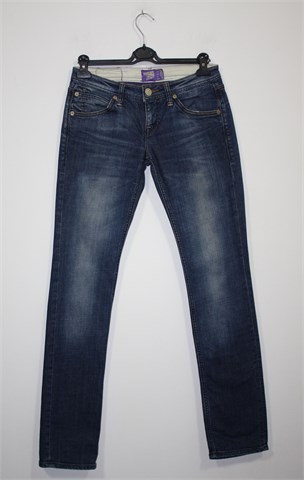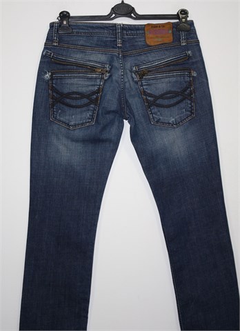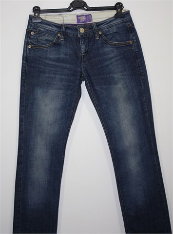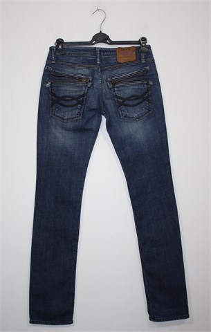 Bershka Denim traper hlače plave boje, mjestimično ispranog i izlizanog izgleda (tvornički used look). Prednji cif i kopčanje, pasica za remen (malo oštećenje na materijalu unutar pasice ali apsolutno nije vidljivo kada se nose). Prednji i stražnji džepovi (stražnji sa cifovima). Blago rastezljive. Plitki model, uže nogavice (model za uže listove i bedra - nisu jako rastezljive pa neće odgovarati nekome tko ima jače listove ili bedra).