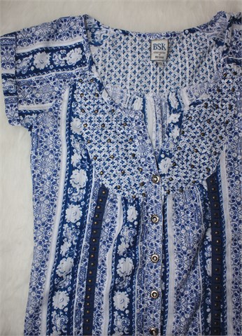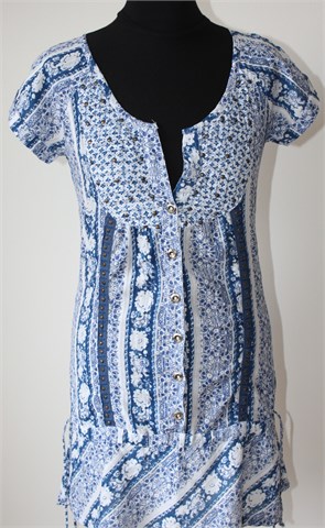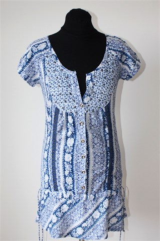 Bershka tunika sa kratkim rukavima, plavo-bijele boje sa printom (uzorak printa vidljiv na slikama), mjestimično ukrašena brončanim aplikacijama i sjajnim srebrnim nitima. Prednje kopčanje (nije cijelom dužinom), vezice bočno na pasici (mogu se po želji stegnuti), mali bočni prorezi. Tanja i lagana, nije rastezljiva.