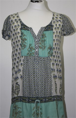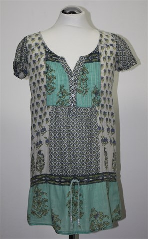 Bershka bluza/tunika sa kratkim rukavima, većinom bijele boje sa šarenim printom. Prednje kopčanje na gumbiće, u bokovima se može stegnuti sa ukrasnom špagicom. Tanak, lagan i prozračan materijal.