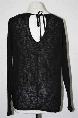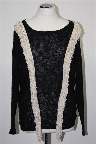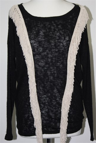 Bershka vesta crne boje (burnt efekt pa je blago prozirna), sa prednje strane ukrašena resastim trakama. Sa stražnje strane mali otvor i vezanje sa špagicama. Mekana, rastezljiva i lagana. U dijelu oko pazuha je šira, uža uz ruku.