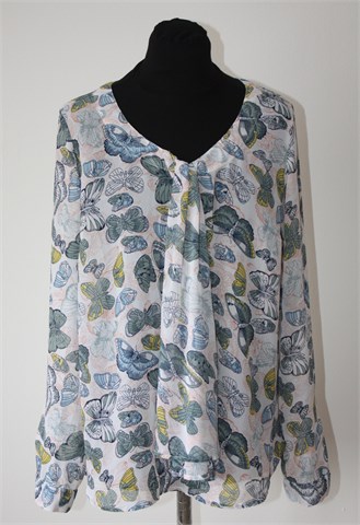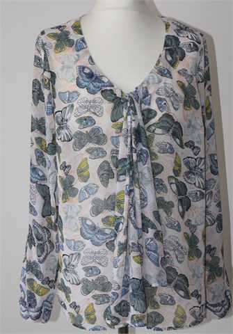 Best Connections bluza sa dugim rukavima, bijele boje sa šarenim printom leptira (boje i uzorak printa vidljivi na slikama). Sa prednje strane našivene dvije trake (na sredini otvora dekoltea) koje se po želji vežu sa prednje strane (kao marama). Tanak i lagan materijal, providan. Nešto duža sa stražnje strane (vidjeti mjere).