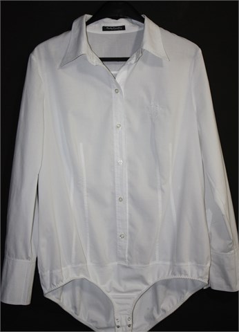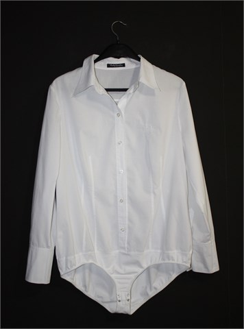 Betty Barclay košulja-body sa dugim rukavima, bijele boje. Prednje kopčanje, prednji i stražnji ušitci. Sa prednje strane diskretna aplikacija-logo od bijelog konca. Mekana, tanja i blago rastezljiva.