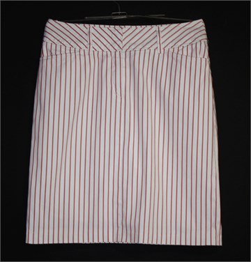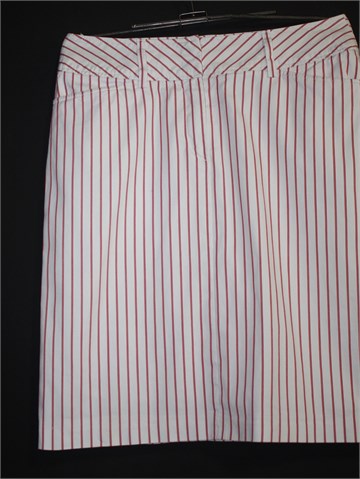 Betty Barclay suknja, bijele boje sa crvenim prugama. Prednji cif i kopčanje, pasica za remen. Prednji bočni džepovi, stražnji rasporak. Podstavljena (podstava je malo rasporena). Vrlo blago rastezljiva.