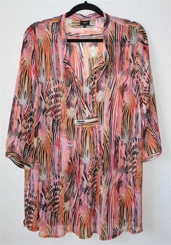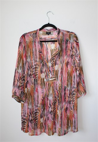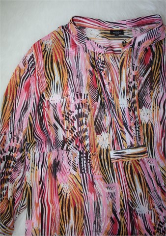 Bexyes bluza/tunika sa poludugim rukavima i šarenim printom (boje i uzorak printa vidljivi na slikama). Sa prednje strane ukrasni ušitci, bočni prorezi. Tanja i lagana, providna. Blago rastezljiva.