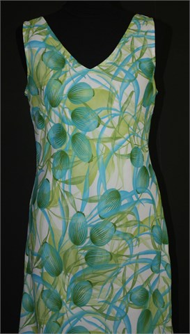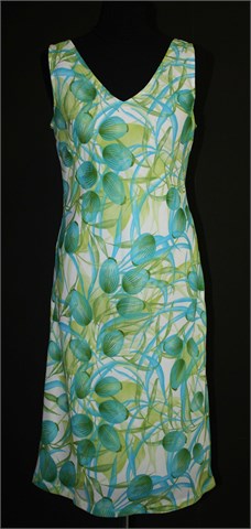 Biaggini haljina bez rukava, bijele boje sa plavo-zelenim cvjentim printom/uzorkom. Prednji i stražnji ušitci (blago strukirana), podstavljena. Lagana i lepršava.